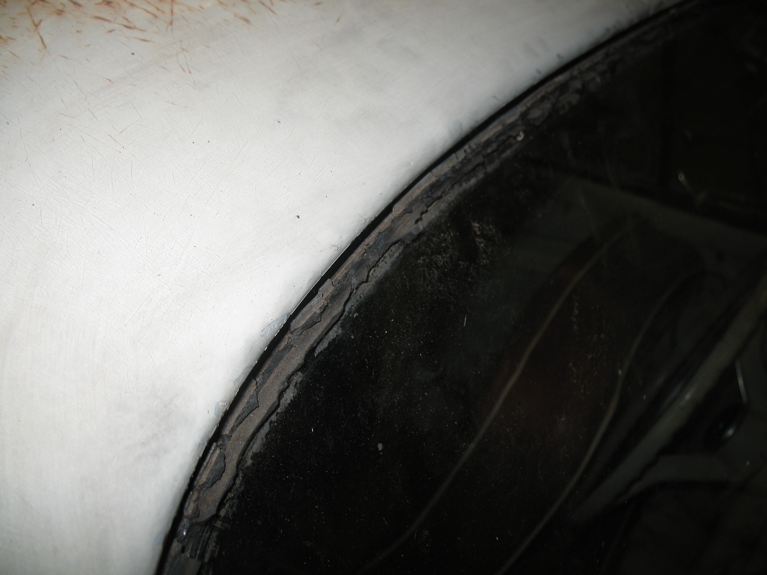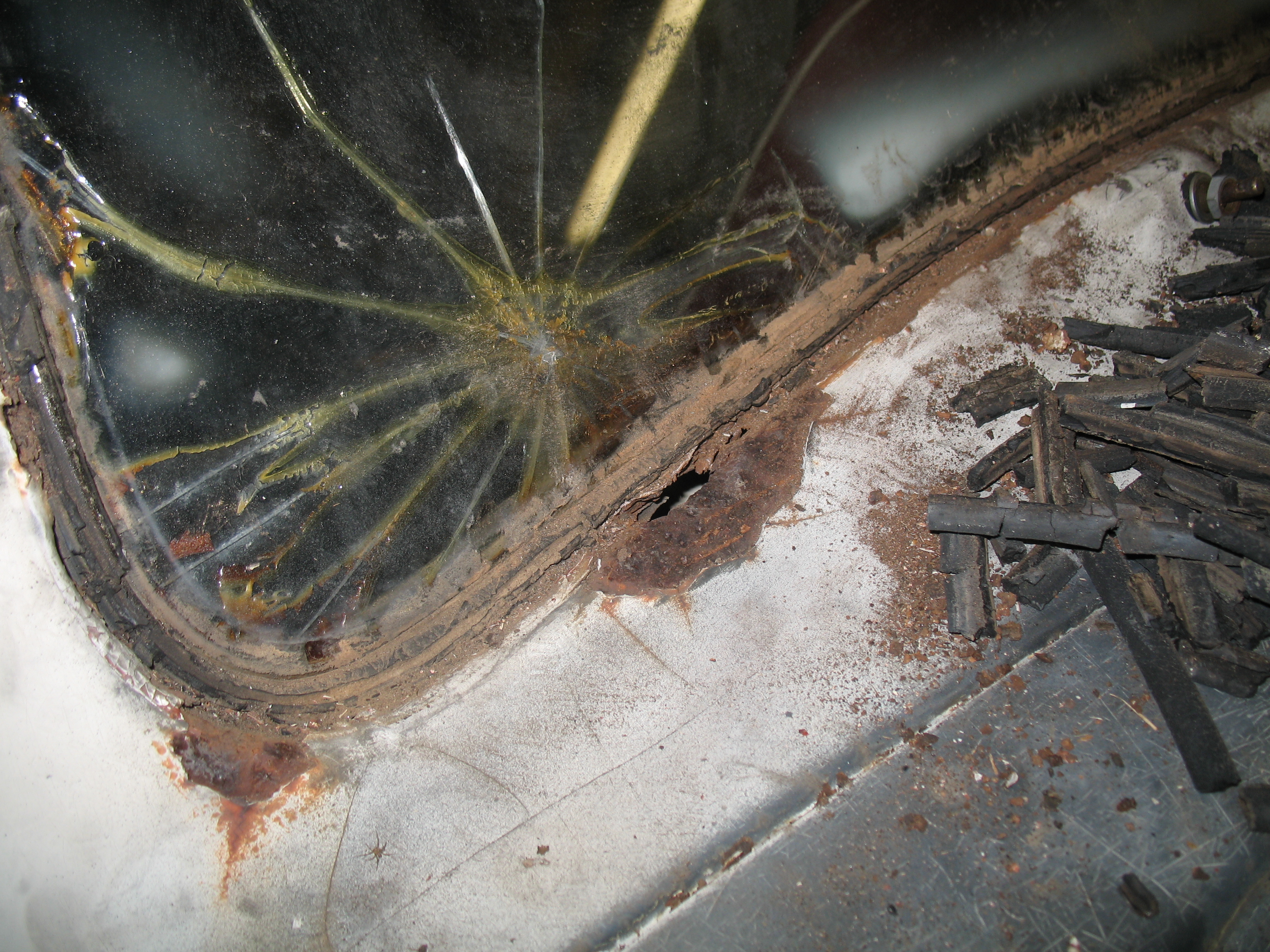 Removed the windshield tonight. The seal rubber was cracked and dry-rotted in some places, but tough and flexible in others. First, I removed the chrome trim pieces, then I cut out the window seal in pieces until I could pull most of it away. Part of the windshield itself is broken, and was stuck together with glue or silicone. The glass also did not look like it was a uniform shape. the edge wavers around the perimeter, as though it was hand-cut. Some of the glass came apart as I was removing it; I can’t imagine this providing any sort of protection in a wreck. I had been looking for an original windshield from the early sixties, but now I beginning to think the safe, best thing to do will be to get a good piece of tempered or layered glass that won’t shatter with impact. It’s probably cheaper in the short-run, and safer in the long-run.
